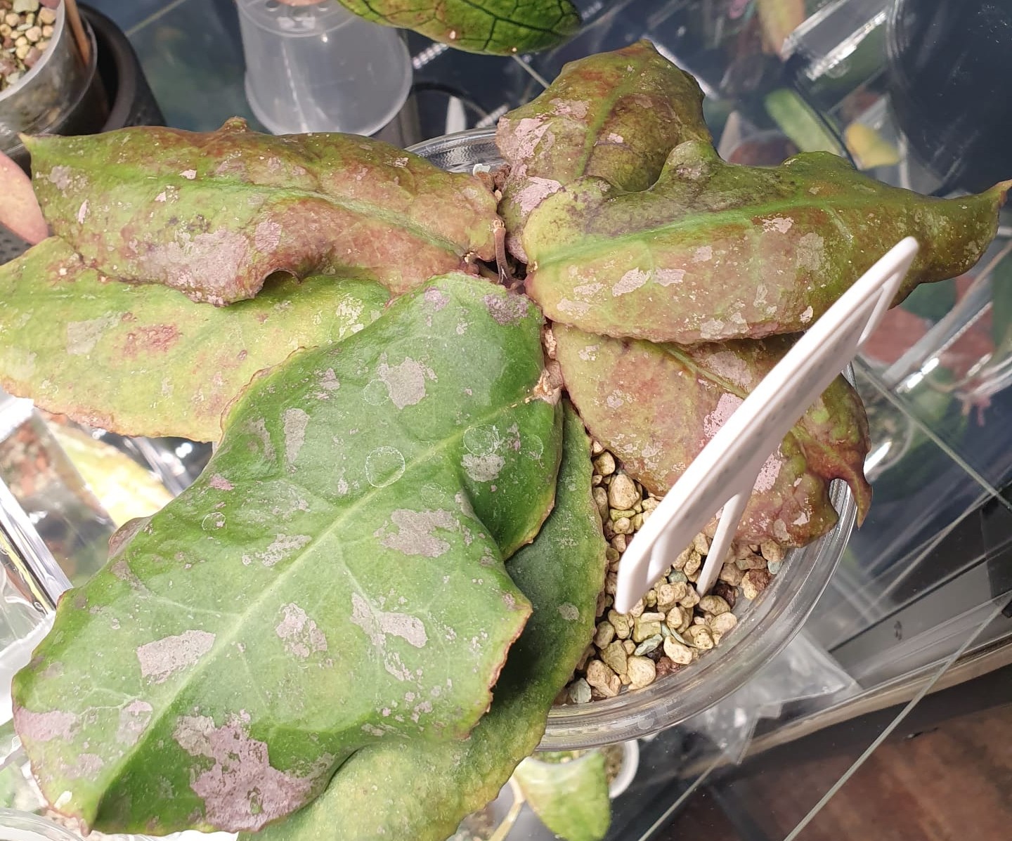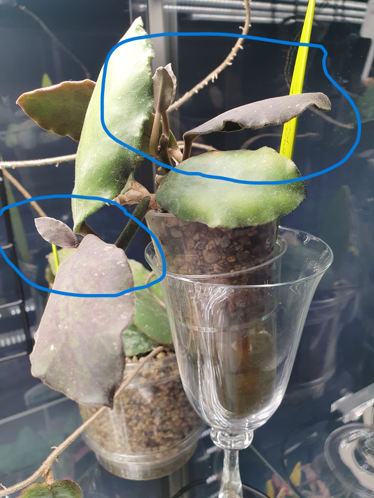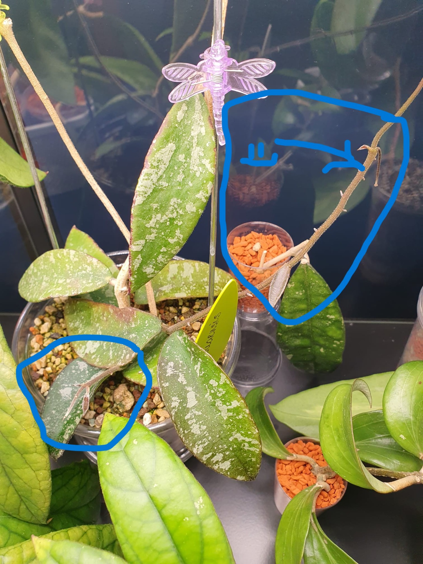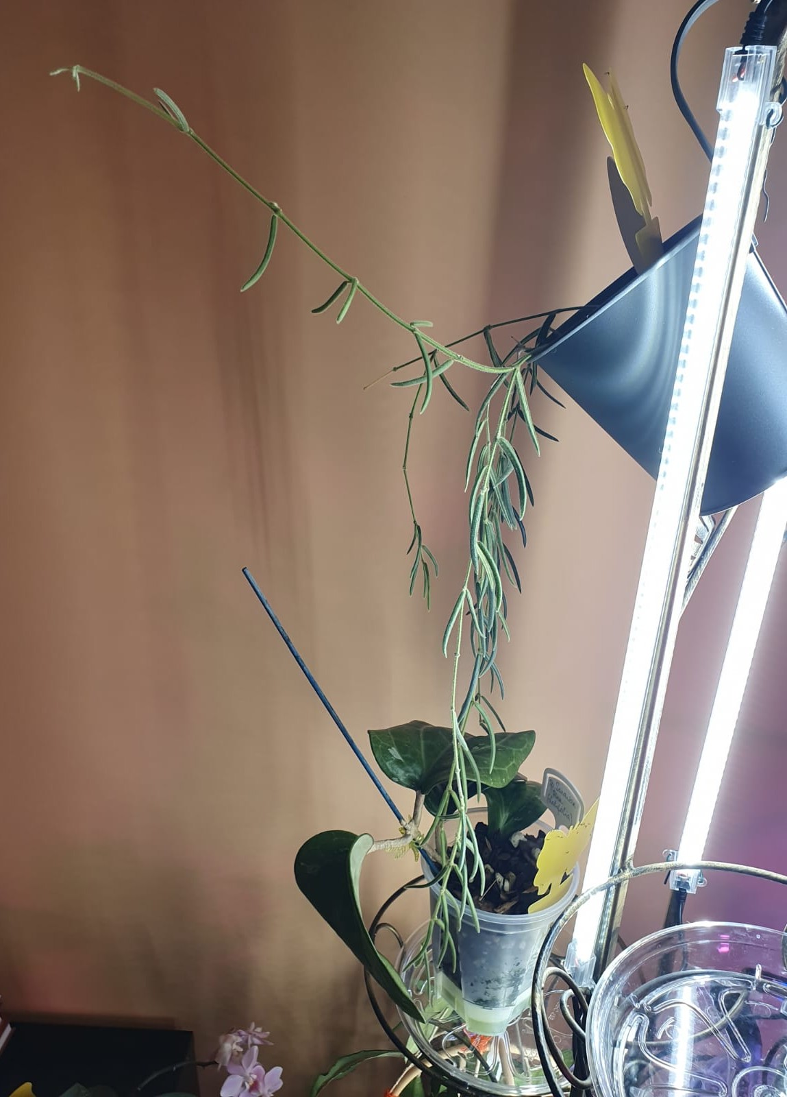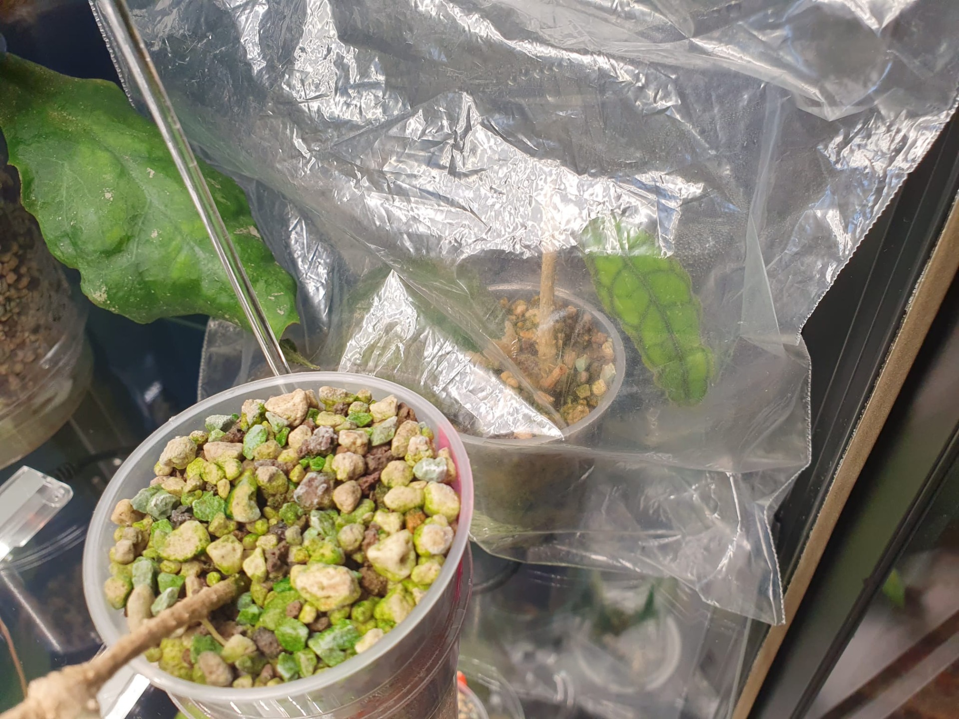 Bet kā jau ar hoijām ir ierasts - atkal ne visas:), jo hoijas ir ļoti dažādas. Piemēram, mana hoija Undulata vasarā stāvēja istabā uz plaukta zem augu lampas, nedaudz paauga, iedeva vienu jaunu lapu un apstājās. Šobrīd ir pārstādīta pašlaistošā podiņā un ielikta vitrīnā Milsbo un audzē reizē 4 jaunas lapiņas. Piemēram, hoijai Waymaniae Borneo arī bija mēģinājums vasarā istabā uz plaukta zem augu lampas augt, pāris jaunas lapiņas izplaucēja, bet ar tik ļoti vāji slēptu entuziasma trūkumu, ka izlēmu paņemt un apsakņot spraudenīti jau laicīgi. Šobrīd gan mātes augs audzē pāris jaunas galotnītes un plaucē pāris lapiņas, gan arī spraudenītis ir apsakņojies un izplaucējis vienu jaunu lapiņu un turpina attīstīties tālāk tikai tāpēc, ka abi stādiņi ir ielikti vitrīnā Milsbo un aug augstākā gaisa mitrumā.