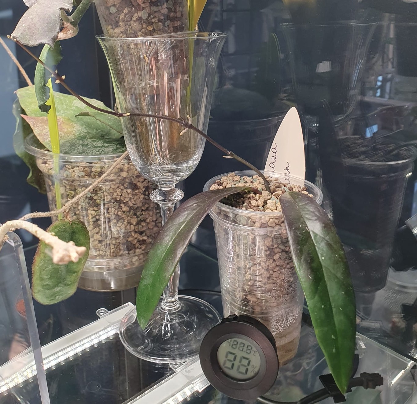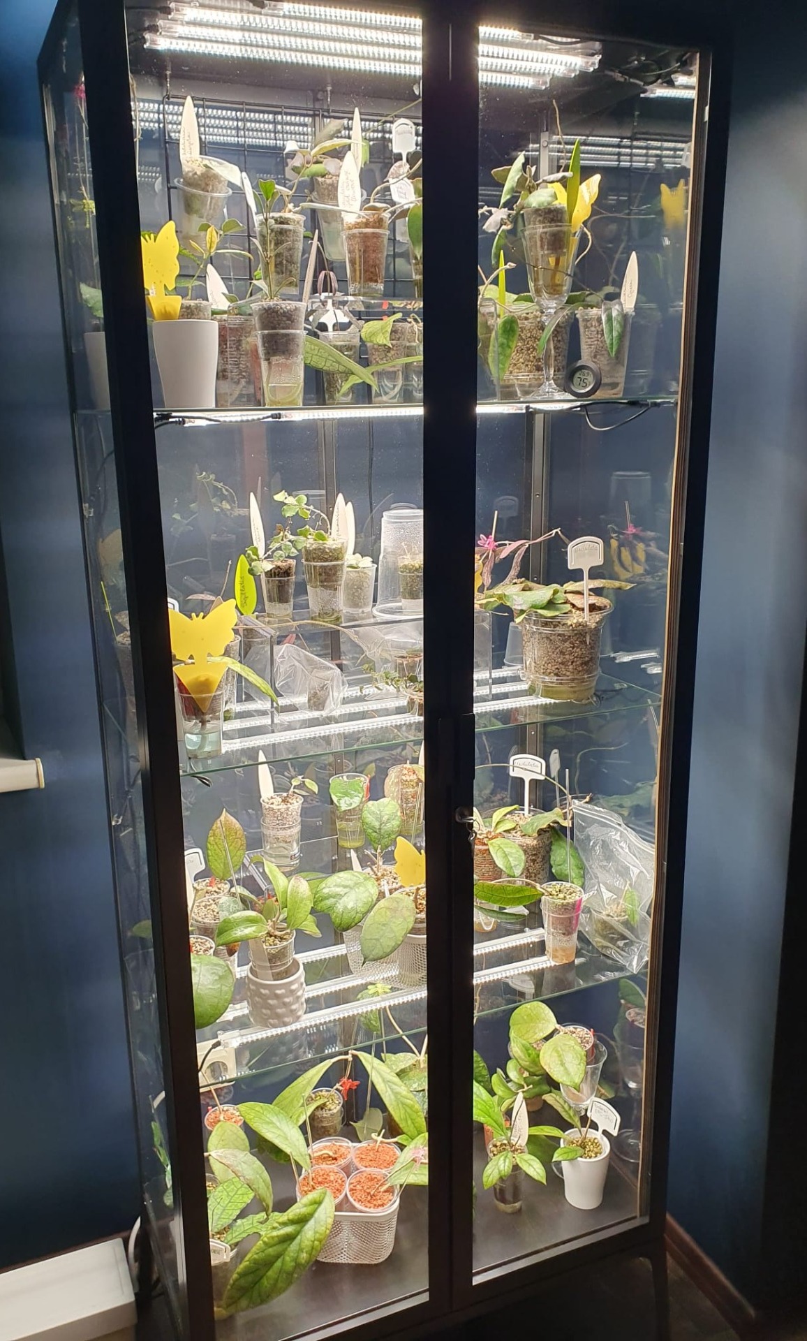 Manā kolekcijā uz šo brīdi ir vairākas tādas hoijas, kuru dēļ šī gada augustā es faktiski arī iegādājos Ikea Milsbo vitrīnu. Šo vitrīnu nedaudz uzlabojot - nolīmējot durvis ar blīvgumijām un ieliekot augu lampas - varu uzturēt gaisa mitrumu šobrīd pie ieslēgtas mājas apkures ap 75%-85%, bet no rītiem, ieslēdzot augu lampas, gaisa mitrums sasniedz pat 95%-99%. Jūtūbā ir ļoti daudz video par tēmu, kā iekārtot šādas vitrīnas, šeit sīkāk par to nerunāšu, tikai piebildīšu, ka esmu ļoti apmierināta ar šo pirkumu - gaumīga vitrīna ar praktisku pielietojumu un iespēju kolekcijā audzēt arī retākas hoiju sugas un šķirnes, kā arī šeit patīk apsakņoties maniem spraudeņiem un izskatās, ka arī, piemēram, hoijai Phuwuaensis ļoti patīk, jo pēc pārstādīšanas pašlaistošajā sistēmā joka pēc ieliku hoiju vitrīnā. Phuwuaensis uzreiz sāka audzēt pāris jaunas ūsas, izplaucēja vairākas jaunas lapiņas, sāka briedināt savu pirmo ziedpumpuru tagad, novembrī:), lai gan uz palodzes augot, būtu jau devusies ziemas miegā līdz pat pavasarim, resp., nu šobrīd hoija visādi mēģina man parādīt, ka var jau lēnām augt arī uz palodzes, bet tomēr augstāks gaisa mitrums un garāks gaismas periods ir tas, par ko viņa ir sapņojusi jau sen:)