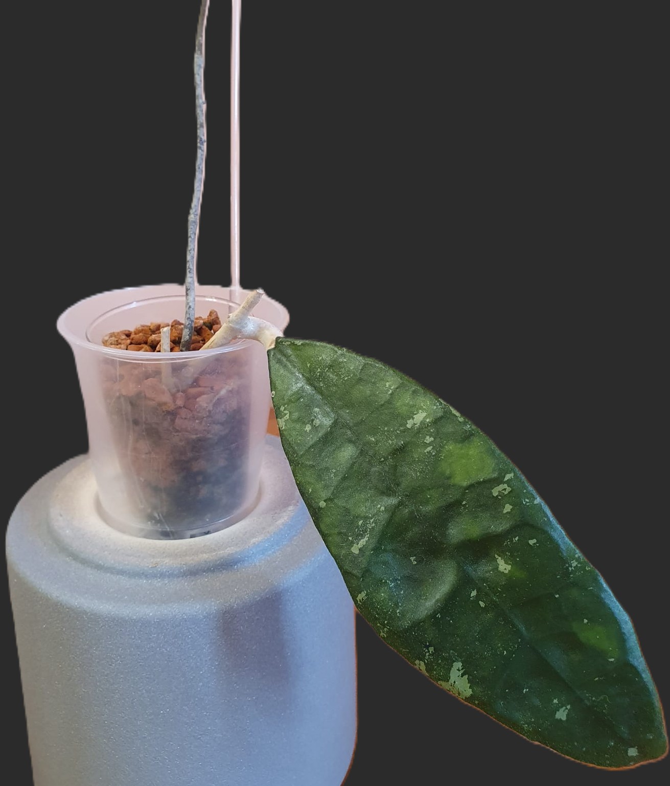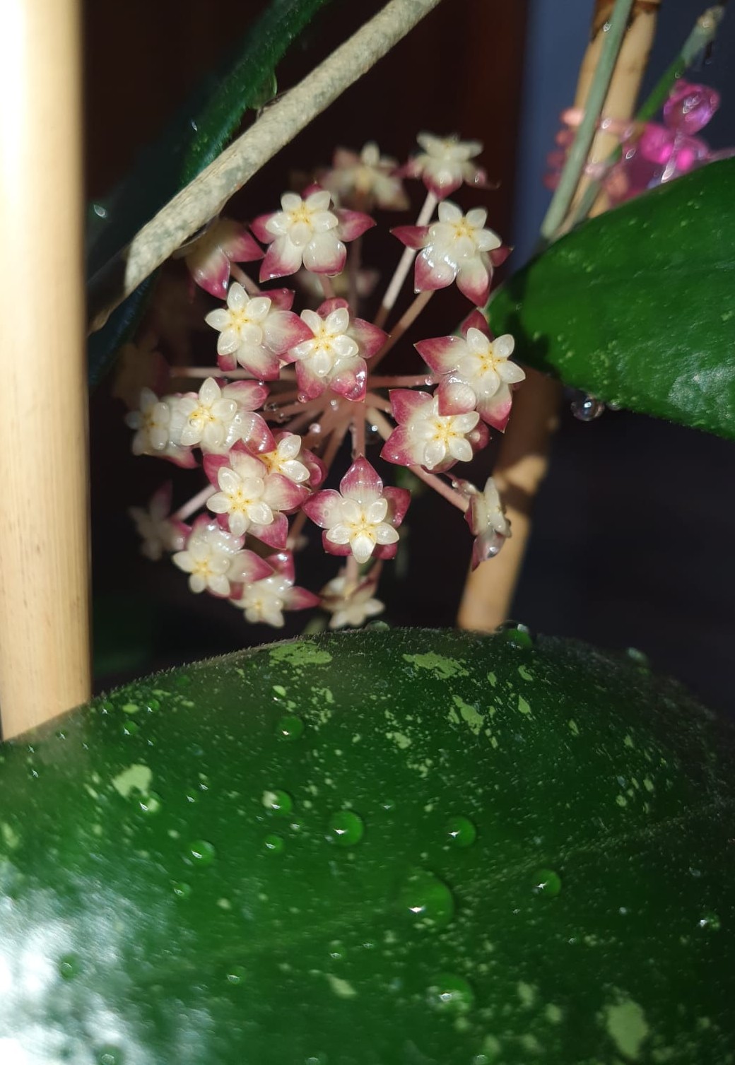 Medium-sized hoya with fairly large, dark green, stiff, ribbed leaves with a slight splash of light green. The flowers are similar to all hoyas of the Finlaysonii group, but are actually darker than other varieties. Smells just as nice. Can grow in various substrates. Likes a bright place, but not direct sunlight. Water when the substrate is dry on the surface. Easy to care for hoya.